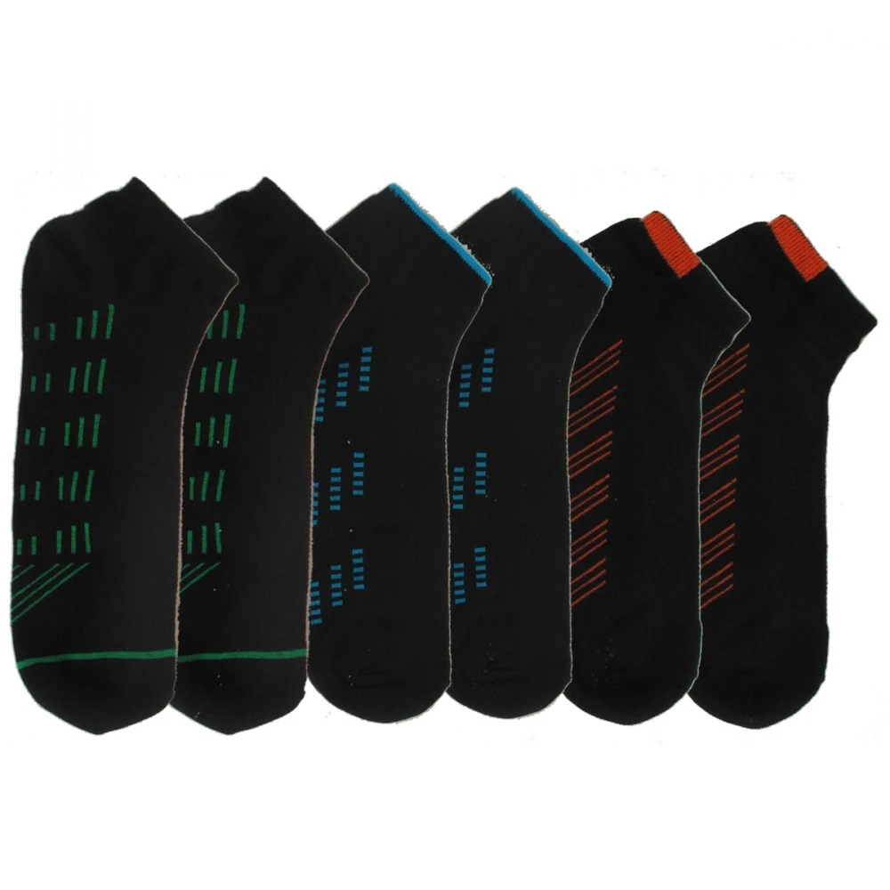 Chaussettes Courtes Homme Motifs Lot de 6 paires avec maille piquée sur pied. 3 lots disponibles: Lot 1 fond blanc avec motifs rouge/noir/bleu + Lot 2 blanc/noir, noir/gris, gris/noir + Lot 3 fond noir avec motifs vert/turquoise/rouge. Disponible en taille 40/46. Composition: 61% coton, 31% polyester, 6% polyamide, 2% elasthanne. Lavable en machine à 30°C.