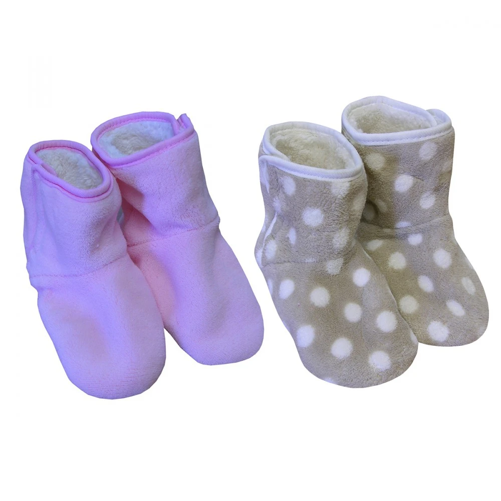 Chaussons Bottines enfant fille unis lot de 2, douces et chaudes avec intérieur fourré et semelle textile antidérapante. Existe en 3 lots : Pois Beige/Rose, Neige Rouge/Gris et Beige/Rose. Disponible en 2 Tailles: 27/30 + 31/34. Composition: Dessus et intérieur Textile 100% Polyester. Lavable en machine à 30°C.