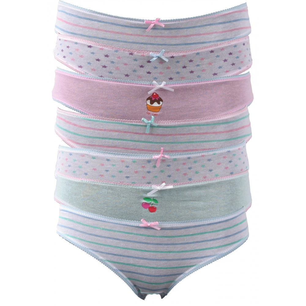 Culottes enfant fille multicolores lot de 7 pièces avec noeud satin et bordures picots. Présentation dans trousse translucide. Disponible en 2 lots avec lot1: Rayures – Fruits – Pois – Gateaux et lot2: Ronds – Fuits – Fleurs. Exite en tailles 2/3 + 3/4 + 5/6 + 7/8 ans. Composition:100% Coton. Lavable en machine à 30°C.