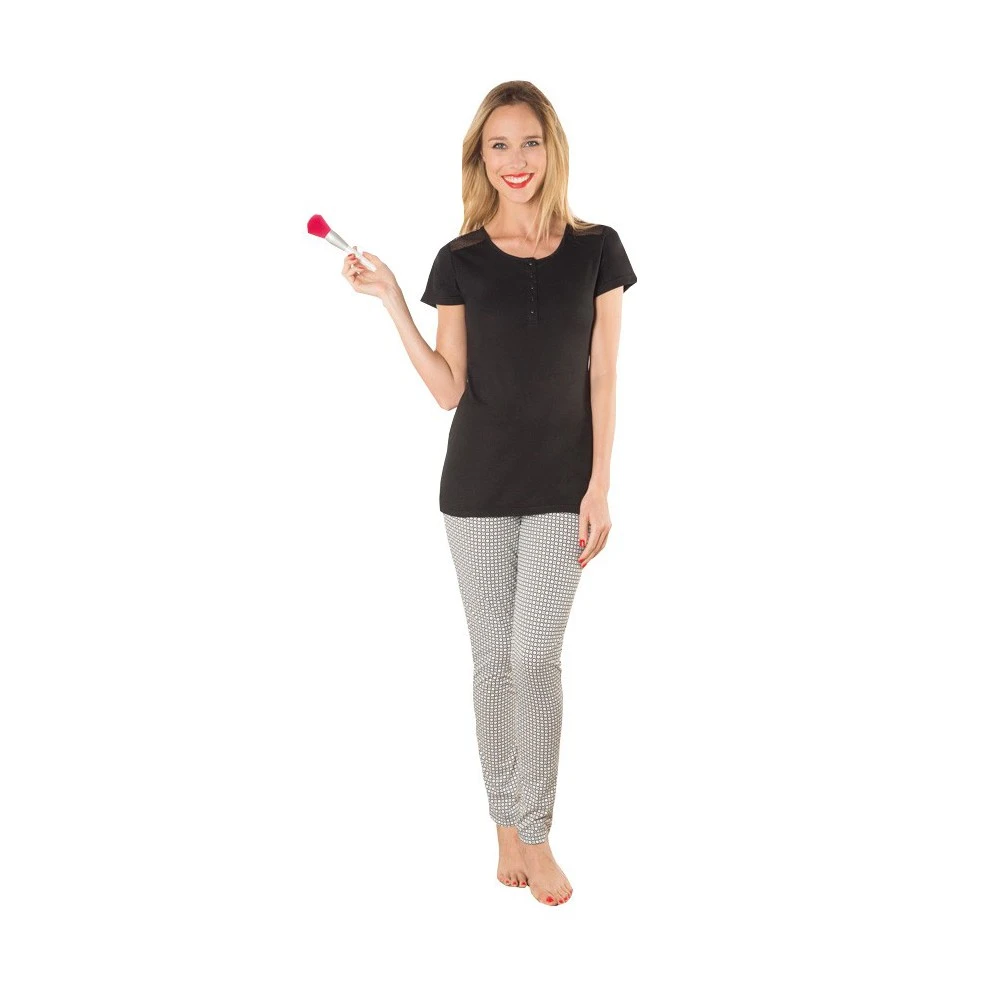 Pyjama Femme Jersey, Vendu à l’unité, T-shirt Manches Courtes Noir boutonné avec poche plaquée à la poitrine, pantalon long taille élastiquée avec lien de resserrage, motif graphique fond Blanc motifs noir. Disponible en tailles: 38/40, 42/44, 46/48 et 50/52. Composition: 65% Polyester, 35% Viscose. Lavable en machine à 30°C.