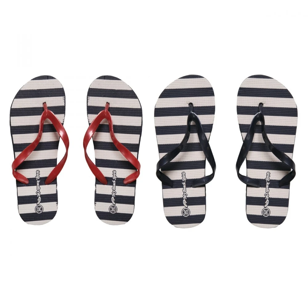 Tongs Fille rayures Lot de 2 paires. Un lot fond blanc/marine rayé avec lanières rouge et marine. Disponible en taille 28/29-30/31-32/33-34/35. Hauteur semelle: 1 cm. Composition: 100% EVA.