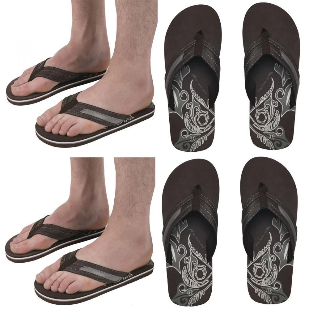 Tongs Homme motifs Tribal Lot de 2 paires. Disponible en coloris Noir/Marron ou Marron x2 . Disponible en taille 40/41 + 42/43 + 44/45. Hauteur semelle: 1.5 cm. Composition: lanière textile et autres matériaux – semelle 100% autres matériaux.